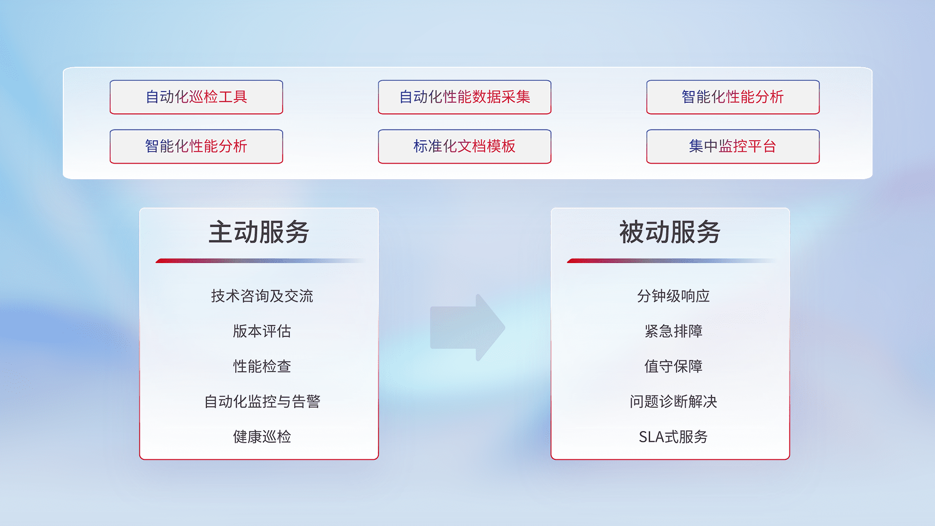 智能化工具和标准化文档,,,,保障服务质量,,,,提供主动服务(包含技术咨询、、版本评估、、、、性能检查、、、、自动化监控与告警、、、健康巡检)和被动服务包含(分钟级响应、、紧急排障、、、、值守保障、、问题诊断解决、、、SLA服务)。。。。